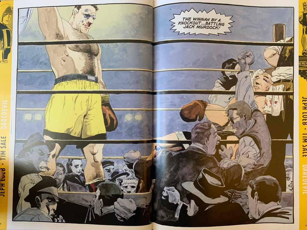 I would be remiss if I did not take the time to properly recognize the beautiful art of this book provided by Tim Sale and Matt Hollingsworth. In the introduction to the gallery edition, Loeb goes into detail about how Sale and Hollingsworth came up with the ink-wash technique for the inking. “He [Sale] poured India Ink … into a coffee cup and added water. It diluted the ink so it became more of a watercolor finish.” In regards to Hollinsgworth, “Working in Photoshop, Matt [Hollingsworth] transformed Tim’s [Sale] gray washes into color, creating the impression, for the reader, that the pages were originally rendered in watercolor.” What all of this, practically, creates is comic book artwork that invokes the feeling of classic Americana like a Norman Rockwell painting. One of the things that so often gets overlooked in creating comic book adaptations for modern audiences is that silver age and golden age comics were products of their time. Coloring, rendering, posing, costume attire – all of these were products of the 40’s and 50’s. These were (more often than not) the ideas of day-dreaming young men imaging what heroes and villains would look like and act in their day and age, not the future. It’s the reason that classic comic outfits look really silly in modern movies or tv shows – Captain America’s original outfit with the goofy boots evokes feelings of swashbuckling pirates, something people in the 40’s would be aware of. All of this to say, Sale understood this and chose an art style that would remind us of “classic America”. Counter to this point, Sale also uses faded images of DD to show movement, and uses splash pages in each issue to set the tone and mood – things that were not common in the 60’s. He also uses color and shading to draw the attention of the reader to the main characters or the focus of a particular panel – the characters in the background of the boxing match in issue 1 are in gray scale, while the boxers are in full color. It is a genius way to not show the reader what matters, but also to highlight the characters perception of what matters – in this particular scene it showcases that Matt only has eyes for his father who is the one fighting in the ring.