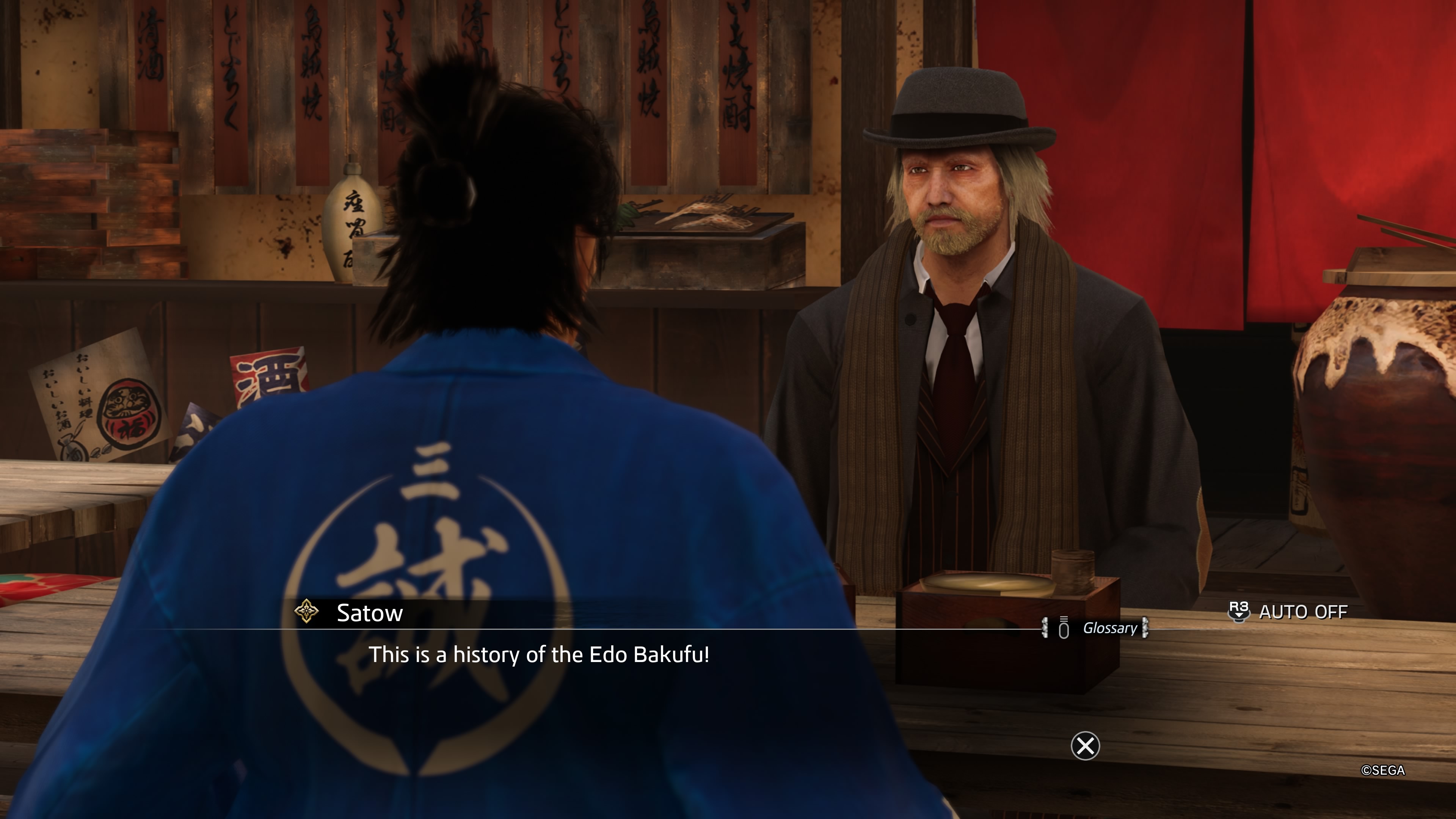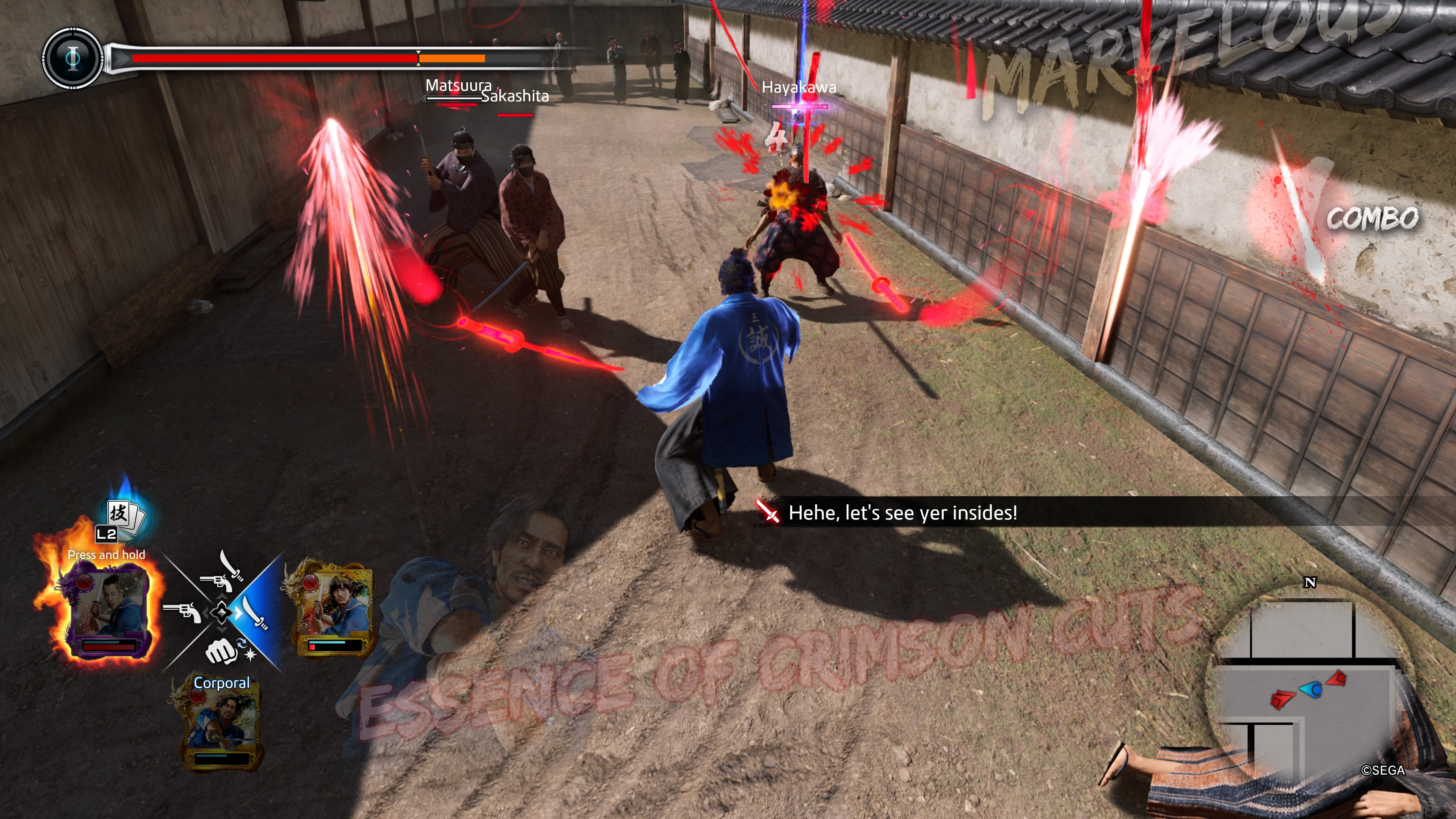 Which leads me to the meat of the game: the combat. Ryoma Sakamoto has four ability wheels, one for fisticuffs, one for the katana, one for the revolver, and one that dual wields both the aforementioned sword and gun. All of these wheels have upgrades and abilities that allow for flashy instakill moves that can disengage one or more opponents in a glorious bloodbath. These moves can be activated in multiple different scenarios, my favorite of which has Sakamoto dashing past a bullet to slash his opponent like a scene from an old samurai film. Once you unlock missions you can equip cards of companions that offer buffs and specific abilities that are on a cooldown like a MOBA. All of these techniques and styles create a gameplay loop fluid enough to both keep the player on their toes and also shoo away boredom. It is in these combat scenarios that the beat-em-up gameplay shows off Gotoku’s mastery of arcade-style combat, formatted perfectly to work in a 3D world. It is during these specific, hectic moments that I am having the most fun, and really feel like a samurai living an alternate life.