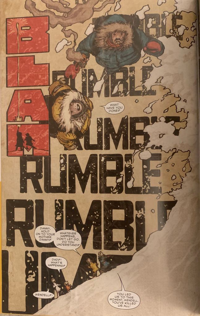 Lastly, I’d like to focus on the use of words and word balloons within the art itself to fulfill a specfic purpose. As discussed earlier, there can be a disconnect between story and art, and some of this is due to the nature of word balloons and the fact that they are placed on top of finished artwork blocking some of the scene. While Andrews is not credited with the lettering in this book, I believe that is more in reference to the stereotypical word balloons and not the onomatopoeia embedded within the artwork itself. Regardless, the artwork on display on page 4 is both densely packed and easy to follow, showing a clear understanding of comic book pacing and layout. The page is fairly simple and can be broken down into three sections: section one is the onomatopoeia of “BLAM”, which is the only 4 panels on the page and contains Danny’s mother and Meachum shooting off a flare, section two which is an arial shot of the two of them looking up at the flare, and section three which is a far away shot showing Danny, his father and mother, and Meachum with an approaching avalanche. All three sections exist within the same nebulous page with no drawn background, and instead have the words “rumble” repeated from top to bottom, growing in size and intesity as you go down the page. While I could go on and on about every single page of this issue, I will just ask that you trust me in my assessment that this entire series is full of gorgeous art – any one of the pages could be on display in an art exhibit showcasing what is possible in comic books.