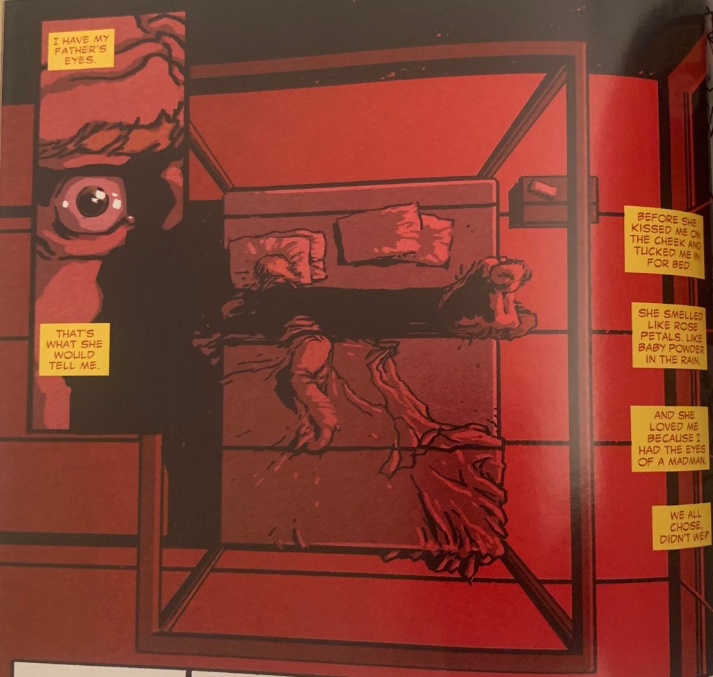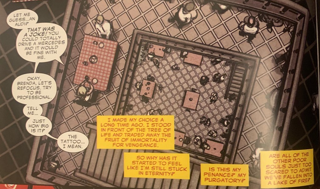 Andrews uses an art style for IF:TLW that is dark – using heavy shadows and monotone colors. The pencil lines are scratchy with heavy borders on characters. There is heavy use of negative space – highlighting how lonely Danny Rand feels. This is not the happy-go-lucky Danny Rand from the 70’s – the hip, kung-fu fighting philanthropist. This Danny Rand is disillusioned to the life of superheroes. He is loathing, destructive, and apathetic. He is still super-powered, but not quite heroic. He is remembering his childhood and the death of his father – something that happened in flashbacks in the original series by Roy Thomas – but reacting to it in a very human way. Historically, tragic things would happen to lead someone on the path of super-heroism, but they would not leave a lasting imprint on the character’s psyche. Andrews explores this idea by focusing on this notion of revenge vs healing. While Danny successfully hunted down his father’s business partner in the early years, we see that the quest for revenge did not lead to healing for Danny. There are two pages in the first issue that are beautifully arranged to convey this sense of helplessness and loneliness Danny is going through. Danny is having a conversation with a reporter in a busy restaurant, with wait-staff and other customers all around. Instead of framing the scene showing their faces switching back and forth, or even from a distance like we are sitting at a nearby table, Andrews instead frames the scene from straight above. This unorthodox view might not coincide with a realistic point of view, but it does an excellent job of showing how trapped and alone Danny feels. He is near the center of the scene, with the walls of the room drawn like the bars of a prison floating in empty space. The second scene shows Danny and the reporter in bed after a one-night-stand. While not quite the same scene, since they are alone in Danny’s bedroom instead of a busy restaurant, Danny is still shown in the center with the bedposts creating a cage. The difference here is in the body language of Danny – he is sitting up, staring at the window – he is contemplating leaving the cage. As the reader, we are unsure at this point as to how Danny will effectively escape his cage, but Andrews quickly answers this by showing Danny jumping out the window through the glass. Did he jump to his doom, or is there something else he is jumping towards?