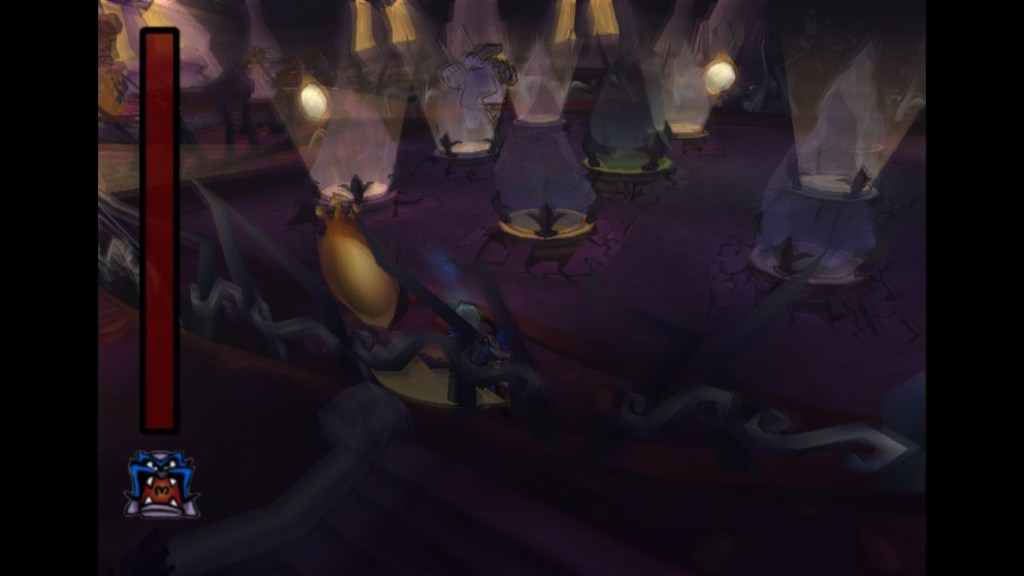 I hated boss fights in video games when I was younger – from Spyro the Dragon, to Crash Bandicoot, and Sly Cooper was no exception. I hated each and every one of them – probably because it required a modicum of strategy and I didn’t have time for that. Sly 1 has five bosses, each with unique mechanics not seen in any other levels, and, contrary to little Ben, they are actually really well designed. Each boss fight focuses on a single mechanic, with increasing level of difficulty. The Sir Raleigh fight in “Tides of Terror” involves precise platforming – jumping from platform to platform, then adding jumping over his tongue. It serves as a roadblock to test how well you are understanding the mechanics and the platforming at this point in the game – because in the next area, it’s about to get harder. In similar fashion, the Mugshot boss fight in “Sunset Snake-Eyes” starts with a game of ring-around-the-rosey where you have to hit mirrors back at Mugshot, burning him and breaking his guns. You do this three times, with the final time being a time-trial on a chandelier involving incredibly precise spire jumps. The only boss fight that is lackluster is the one against the Panda King, which basically devolves into a beat-em-up with little strategy. Even so, the visuals in this fight and the references to 70’s Kung-Fu movies is quite well done. In summary, the boss fights in Sly 1 are very dynamic and unique, and break away from the typical platforming bosses that are just big versions on regular enemies, while keeping the same tropes of the genre like the “3 hits to kill”.
