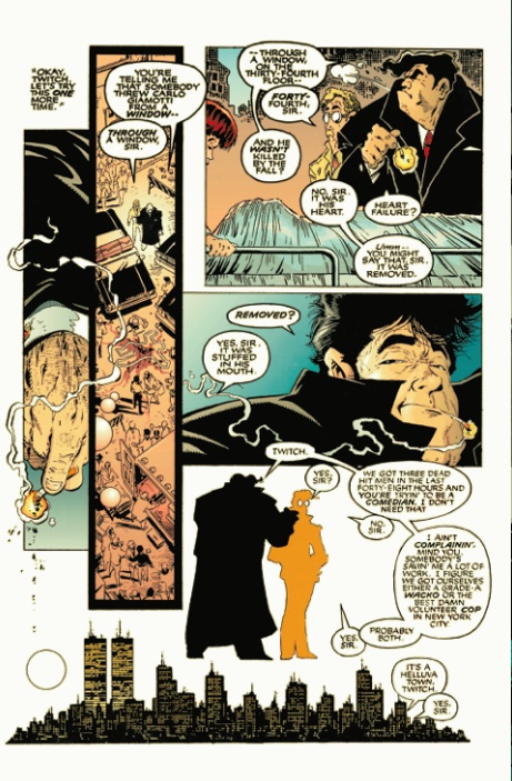 In my article showcasing August: Purgatory Underground, I discussed how one of the harder aspects of independent comic books is not having an established set of characters that the reader recognizes. McFarlane is no different with Spawn, and uses page 10 to introduce the reader to two of Spawn’s supporting cast – the NYPD Detectives Sam Burke and Max “Twitch” Williams. Sam and Twitch have some light banter back and forth and the basic dynamic between the two is paved out – Sam is the “cut-the-corners” kind of cop, while Twitch is very factual, to the point, and a little submissive. They show up and then leave quite succinctly, and I find this page to be a little hard to follow due to the composition. McFarlane is famous for this intricate character work, but he finds clever ways to avoid doing backgrounds whenever he can to save some time – and this page is a perfect example of this. This comic has been a slow burn up to this point – and with the full costume reveal being just a spreadpage earlier, McFarlane needs to knock it out of the park in the second half.
